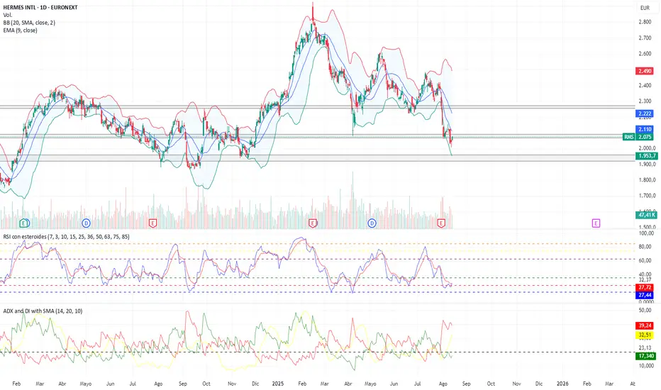 Hermès en resistencia y con RSI en mínimos 📉. Presentó resultados excelentes ✅, aunque futuros impuestos más altos (supuestamente provisionales) podrían pesar. A corto plazo, oportunidad. #trading #bolsa