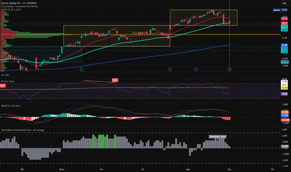 Las acciones de Ryanair mantienen en 2025 un sesgo alcista de fondo, apoyadas en la recuperación del tráfico aéreo y en su sólida generación de caja. El valor rompió a finales de julio el rango de consolidación entre €21,98 y €24,82, alcanzando un máximo anual en €27,01. Sin embargo, tras ese impulso, corrigió con fuerza hasta los €25,12, nivel donde ha vuelto a encontrar apoyo. El Punto de control (POC) más relevante se ubica en los €23,52, coincidiendo con la zona media del anterior rango de consolidación. Técnicamente, el precio ha perdido el soporte de la media de 50 sesiones, aunque se mantiene sobre la media de 100, lo que refuerza el escenario de consolidación aunque ligeramente bajista. Los indicadores acompañan esta lectura: el RSI se sitúa en 43,09%, en ligera sobreventa, mientras que el MACD refleja presión correctiva bajista.