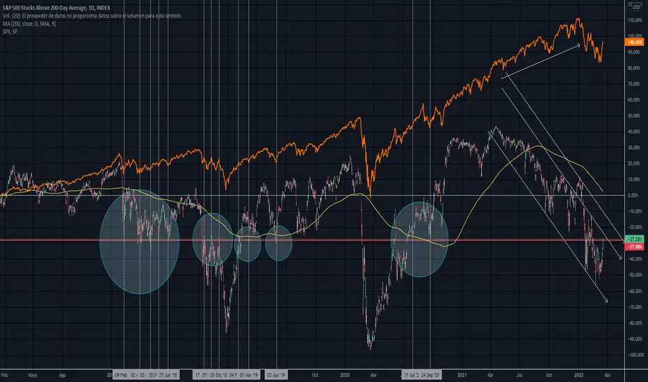 Comparación de SPX y S5TH (Índice de componentes de SPX que están por encima de su 200DMA). Se ve claramente una divergencia entre ambos que comenzó el 24/04/21. Claro las divergencias pueden durar mucho tiempo... hasta que se resuelven. Finalmente SPX siguió el camino marcado por S5TH que estaba mostrando un deterioro interno de SPX.