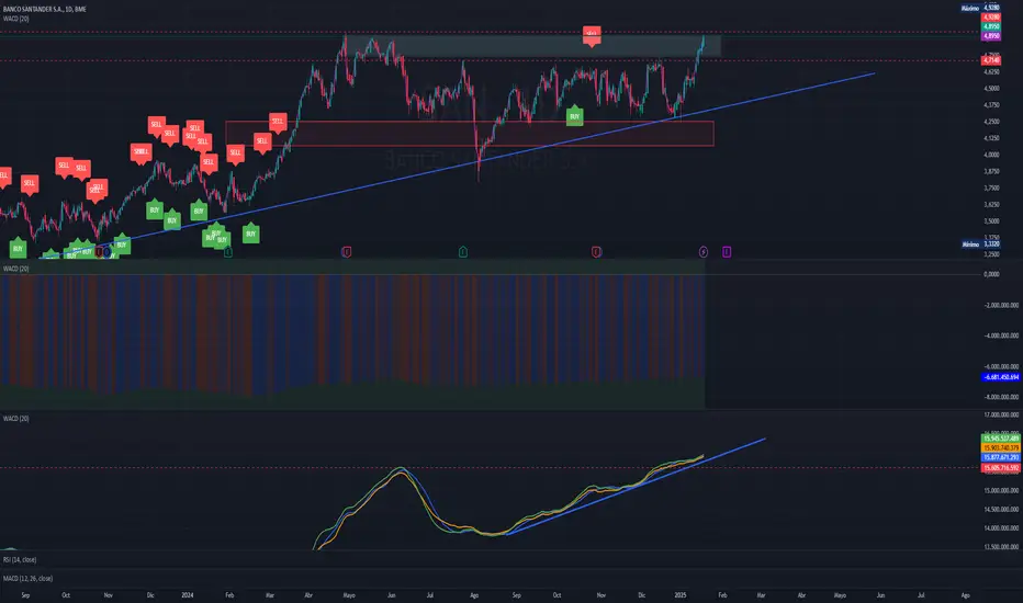 En gráfico diario, Empleando el indicador WACD de ActivTrades, actualmente la acción se encuentra en un rango lateral, la triple media suavizada nos indica una clara perforación de su última zona alta. Coincidente con la zona alta de los meses de abril y mayo de 2024.Los volúmenes de delta acumulado muestran una continuación alcista con una contracción paulatina del volumen. Si nos fijamos en el VWAP y las señales de SELL y BUY del indicador, en gráfico diario no se han dado señales , pero si se han dado en gráfico de 1Hora previo al movimiento que se ha dado en las últimas tres jornadas. Se puede ver que se ha perforado claramente el rango lateral de la acción iniciado en mayo 2024, por lo que hay que esperar a ver si la acción alcanza su cota de máximos y continua su movimiento alcista, o procede a corregir posteriormente.