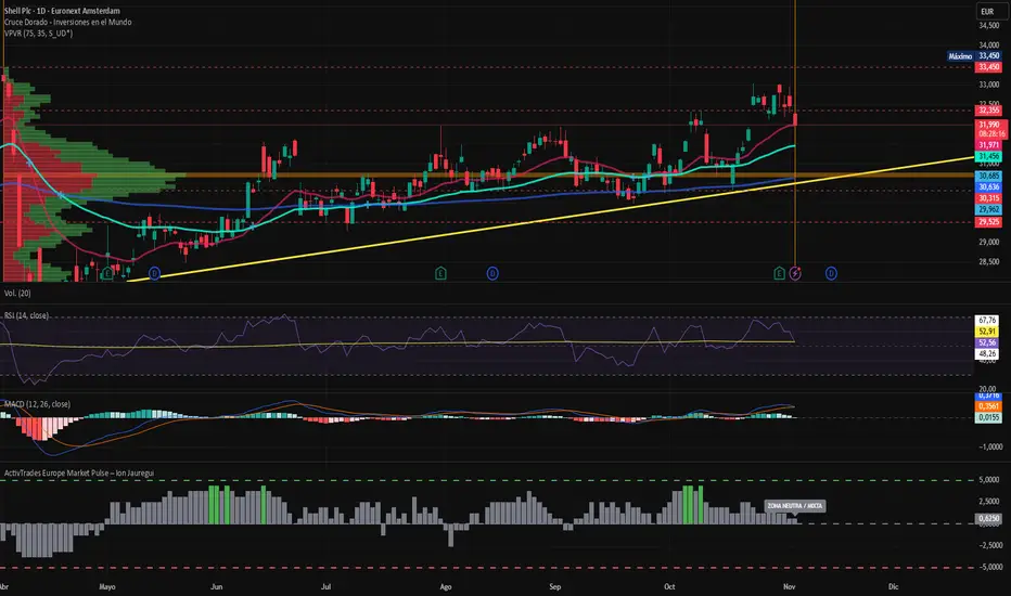 En el plano técnico, Shell (Ticker AT:SHELL.NE /SHELL.UK), muestra una estructura en la que ha tratado de perforar los máximos alcanzados en el primer semestre de 2025. El precio mantiene en la apertura de hoy por encima de los 33,35 euros justo por encima de la media de 50 días. El punto de control actual (POC) se ubica entorno a los 30,75 euros, siendo la zona más negociada desde enero de este año. Si el soporte actual no se sostiene, podríamos ver un descenso a la zona del punto de control, que coincide prácticamente con el área del último impulso. El indicador RSI actualmente se muestra correctivo a la zona neutral, y MACD se haya en una tendencia alcista con un histograma sin volumen, lo que podría estar resaltando cierto agotamiento de tendencia y movimiento hacia la lateralización debido a un equilibrio entre compradores y vendedores. Por otra parte el índicador ActivTrades Europe Market Pulse nos señala neutralidad y equilibrio en el Riesgo por lo que esta semana podría ser un claro movimiento de lateralización del precio. No obstante, la estructura de máximos y mínimos crecientes en gráfico semanal respalda una visión de largo plazo constructiva, siempre que se mantenga la fortaleza del flujo de caja y la rentabilidad del capital.