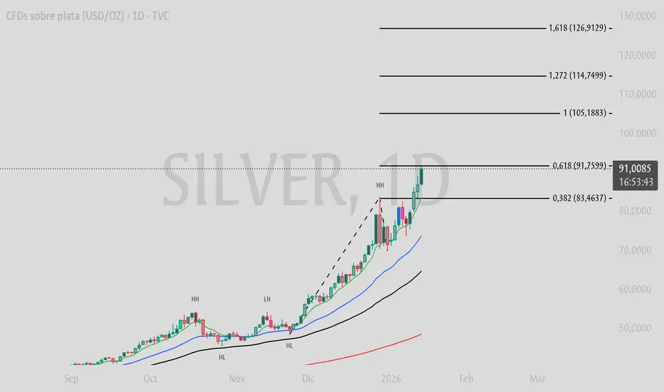 Resumen: La plata mantiene una estructura alcista sólida en temporalidad diaria y, al operar en máximos históricos, el análisis se centra en las extensiones de Fibonacci. El 0.618 actúa como punto crítico de decisión; el 1.0 como zona de pausa y consolidación; el 1.272 como área típica de toma de beneficios; y el 1.618 como nivel de sobreextensión, donde aumenta la probabilidad de distribución o correcciones. La lectura sigue siendo técnica y contextual, priorizando siempre la reacción del precio en cada nivel.