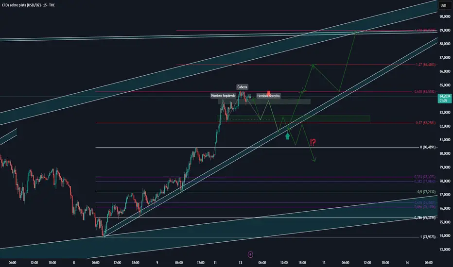 Actualizando las perspectivas anteriores, después de esta apertura tan fuerte que ha tenido la plata teniendo aunque leve un máximo histórico 84,5382, veo que el precio quiera entrar en un periodo de retroceso formando un patrón de cambio hombro cabeza hombro, si este patrón se confirma podríamos ver que el precio desafié y rompa la directriz teniendo retrocesos mas importantes, si esto sucede estaré subiendo los retrocesos mas probables con sus precios.