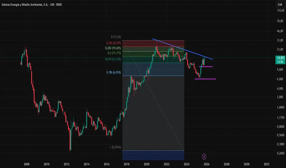 Analizada la serie de precios desde 2012 hasta 2021, se observa una corrección del 0,786 hasta los mínimos de 6,30 de abril de 2025.