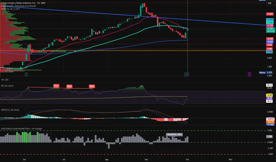 En el plano técnico, Solaria ha atravesado una corrección clásica tras el fuerte rally que llevó su cotización de 6 a 14,30 euros entre abril y agosto. Actualmente, la acción cotiza alrededor de 11,33 euros, tras tocar un mínimo de 10,20 euros, y está formando una pauta envolvente alcista, señal de un posible nuevo impulso al alza. Los niveles de soporte clave se encuentran en 10,30 euros y 9,30 euros, mientras que las resistencias están situadas en 12,60 euros y 14 euros. Un cierre por encima de los 13 euros podría abrir el camino hacia nuevos máximos, manteniendo el atractivo de la acción. Si observamos el apartado de indicadores RSI y MACD se hayan en proceso de recuperación alcista. El primero en 46,94 y el segundo aún en territorio negativo pero con perspectiva de giro alcista. Si observamos los cruces de medias, se ha dado un cruce bajista en la media de 50 cayendo por debajo de la de 100 días. El precio actualmente se soporta sobre la media de 200 días. Si el precio perfora el valor de las medias por encima de los 12 en las resistencias actuales podríamos ver este avance mencionado. En contraposición el Punto de Control (POC) se haya entorno a los 10,20 euros por encima de los mínimos anuales de 9,06 euros. De darse un impulso de los toros, podremos ver una búsqueda de los 13, euros como resistencia clave para buscar los máximos. De darse una continuación de la corrección, la línea del punto de control será clave para presenciar si el precio se sostiene. Desde el punto de vista intuitivo podemos ver que el precio ha tocado suelo técnico el martes y no parece que vaya a bajar más.