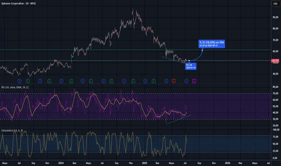 Mientras el precio marcaba mínimos similares (~52 USD), el RSI (9) formó mínimos ascendentes, señalando una divergencia alcista clásica.