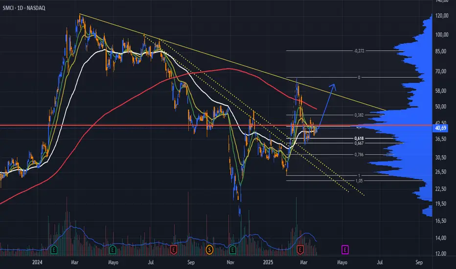 después del retroceso del último impulso alcista que rompión la TL bajista de corto plazo que traía y luego rebotar en el 61.8 fibo, el precio se encuentra en una compresión entre las EMAs de 10, 21 y 55 y aguantando sobre el área de soporte por volumen de precio.Tendría que ir a buscar la TL bajista de mediano plazo que anteriormente ofició como resistencia.