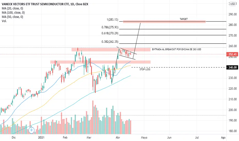 Esperamos una entrada en el momento de superar esa zona y tanto la extensión de fibonacci como el banderín nos dan una proyección a la zona de los 283 USD, con el stop loss en la zona de los 240 USD por debajo de una zona de demanda importante en el precio.