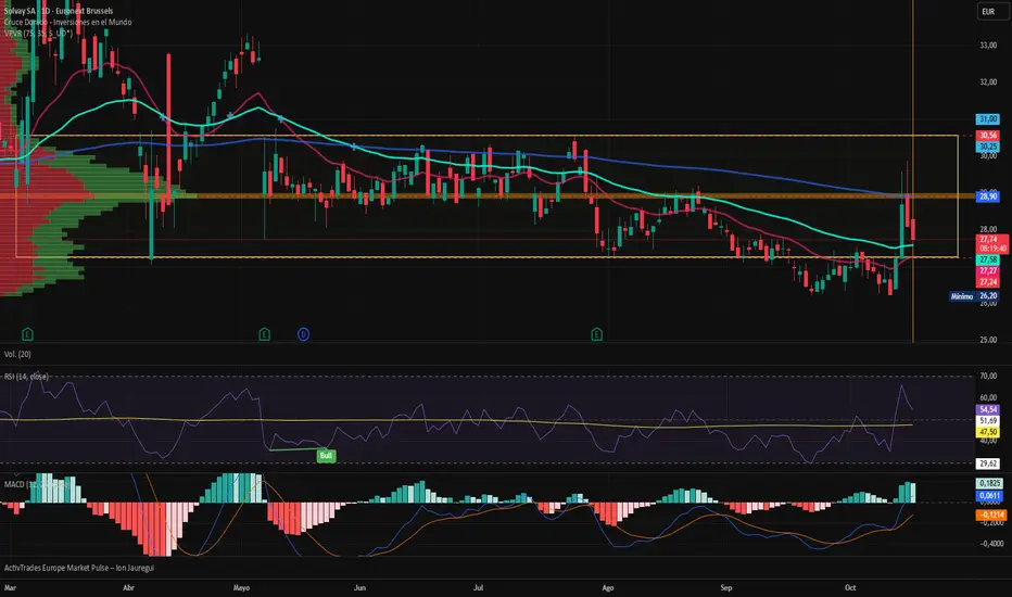 En bolsa, Solvay (Ticker AT: SOLB.BE) cotiza en torno a los €28 por acción, con un comportamiento estable tras un año de transición corporativa y expansión de su negocio avanzado en materiales críticos. El segmento de Performance Chemicals mantiene márgenes sólidos y una buena generación de caja, mientras que la compañía acelera su transformación hacia la química sostenible y la tecnología avanzada. Observando el gráfico podemos ver que la acción ha realizado un desplazamiento en el rango entre los €30,56 – €26,20 . Actualmente el cruce de medias nos señala una tendencia bajista iniciada en mayo que ha desplazado el precio ligeramente fuera del rango indicado. En las últimas 4 sesiones este movimiento se ha revertido a la media del rango con un inicio de sesión bajista que parece continuar el desplazamiento a la baja. Por otra parte el indicador RSI ha señalado dicha corrección con 53,72% en estos momentos. MACD nos señala una recuperación con el histograma en positivo y el Punto de Control en la zona media. Podría tratarse en una pausa para avanzar a la parte alta del rango en máximos de este año.