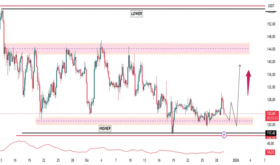 Una ruptura clara por debajo de 117 USDT invalidaría el escenario alcista.