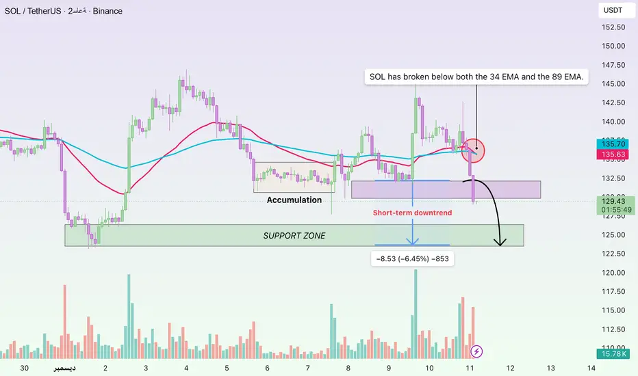 على الرسم البياني 2H، فقدت SOL رسميًا هيكل الاتجاه الصاعد مع إغلاق السعر بقوة أدنى كل من EMA 34 و EMA 89. يشير الإغلاق دون هذه المتوسطات إلى أن الزخم الصاعد قد انكسر وأن الاتجاه قصير المدى أصبح هابطًا. كما أن كسر منطقة الدعم 134–135$ يؤكد حدوث Break of Structure هابط، مصحوبًا بارتفاع حجم البيع — مما يدل على أن هذا بيع حقيقي وليس مجرد ضوضاء.