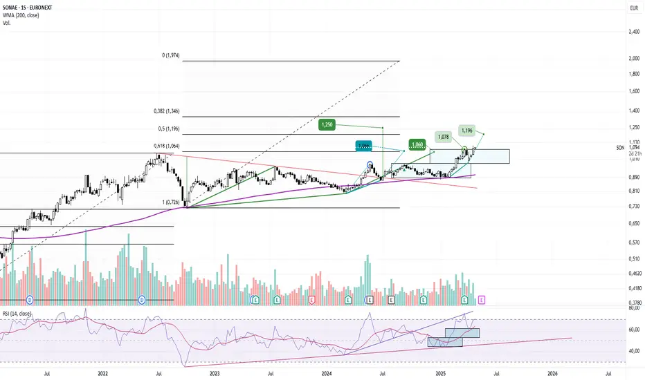 Sonae sigue con buen pie, después de haber cumplido el doble suelo, al superar 1,078€ su objetivo por apoyo en directriz alcista sería en 1,195€.