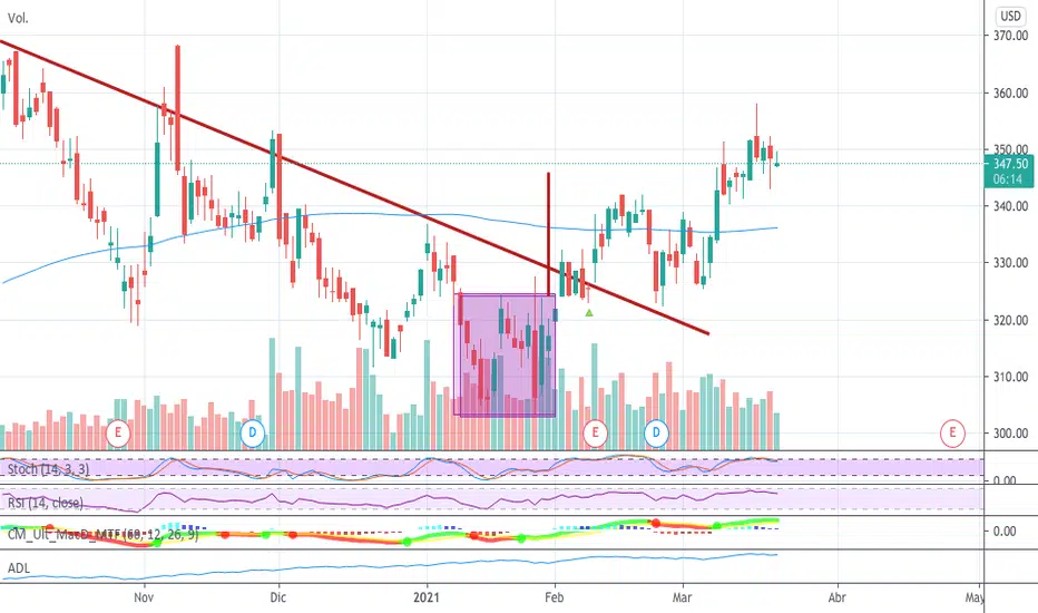 Os avisé en febrero de lo siguiente: "Este valor, tras corrección a niveles FIBO 38% de toda el rally desde marzo '20, ha dejado una estructura de doble suelo de corto plazo con objetivo en los 345 $. Además, si rompe la media de 200 sesiones y supera el anterior máximo decreciente, serían buenas señales de que el valor cambia su tendencia de corto plazo a alcista y retoma las subidas para atacar máximos históricos. Por si fuera poco lo anterior, además tiene una estructura de segundo impulso alcista de largo plazo activada con objetivo en los 481 $. Valor alcista en el medio y largo plazo y que parece que también lo quiere ser en el corto. Ideal para entrar tras correcciones como la que está teniendo lugar. Estaremos atentos para entrar si confirma la mejoría con la ruptura de la media móvil y la superación del máximo decreciente anterior."