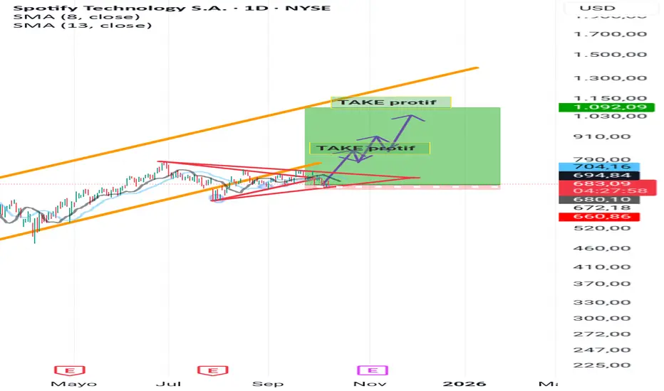 Cómo paso anteriormente con ALIBABA se formó un triangulo principal y el precio lo rompió a la baja formando un soporte y dando paso a nuevo triangulo, el precio se salio del canal alcista mayor, y en esta situación es favorable que regrese dentro de canal y continúe su tendencia mayor, como uno de los líderes de mercado en su sector. en caso contrario el SL es muy corto para evitar pérdidas, relación riesgo-beneficio muy buena SUERTE SPOTIFY