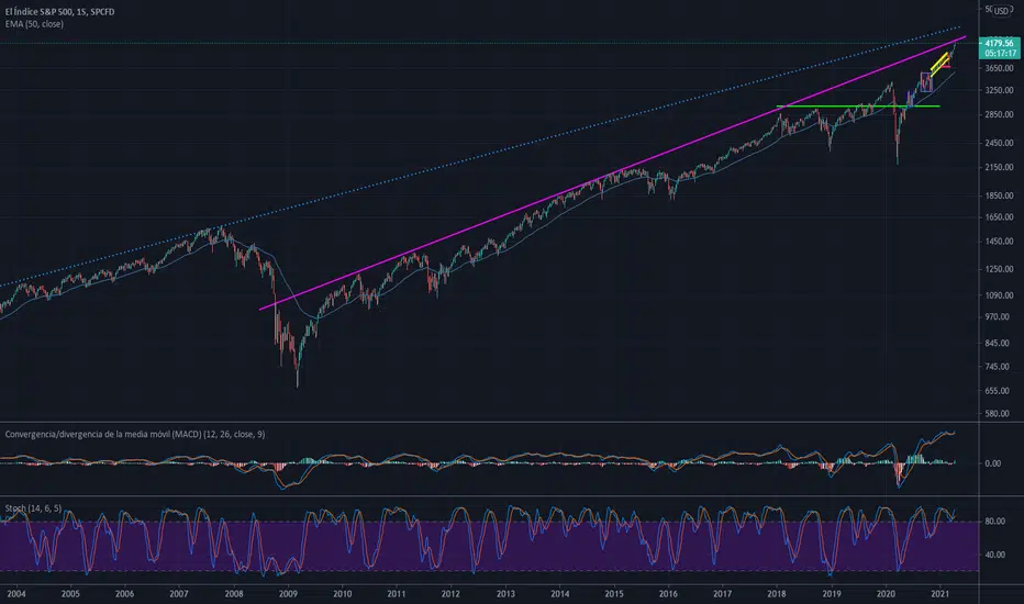 Además, el SP500 ha entrado en una zona potencialmente correctiva a lo largo de esta semana. Se trata de la llegada a la resistencia ascendente desde el año 2009. Esta resistencia, al ser ascendente, se eleva una media del 1% cada mes si no se consigue batir. Actualmente estamos a un 5% de distancia aproximadamente, por lo que de no llegar a este nivel a final de mes, deberíamos sumar otro punto porcentual más.