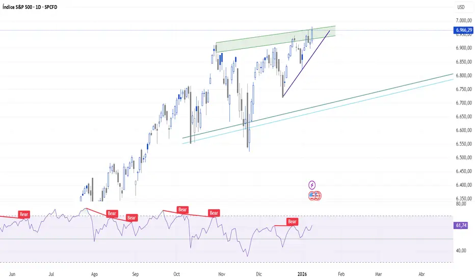Divergencia Bajista en RSI: Un factor determinante en este análisis es la presencia de una divergencia negativa en el RSI. Mientras el precio intenta sostenerse en niveles altos, el oscilador muestra máximos decrecientes, lo que confirma una pérdida de fuerza (momentum) en la tendencia actual.