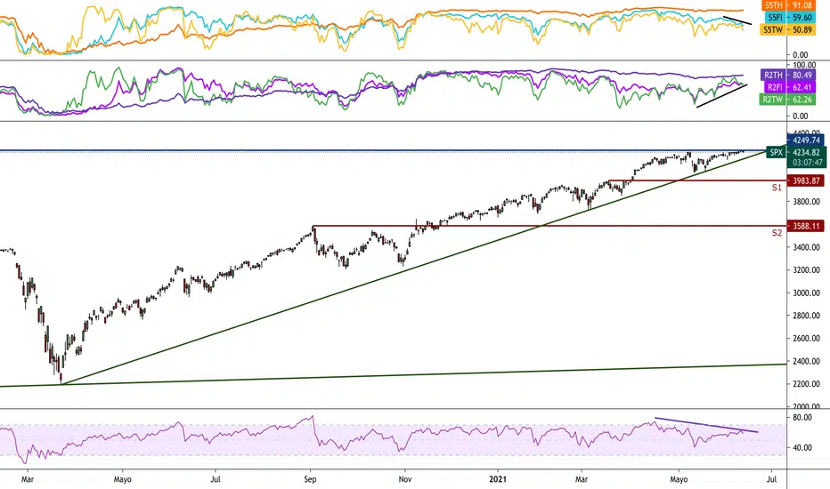 Podemos también identificar una divergencia bajista con el RSI, a la que estamos prestando atención. Esta divergencia quedará invalidada con un cruce del indicador por encima de 74.