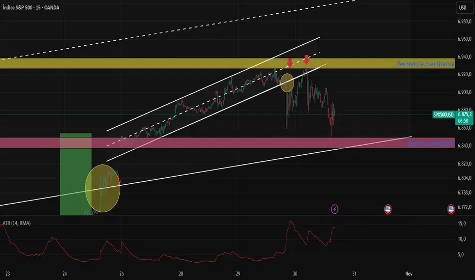 El S&P 500 ha formado un Doble Techo en la zona de resistencia cuantitativa (6900-6920) en el gráfico de 15 minutos, indicando agotamiento tras un fuerte impulso.
