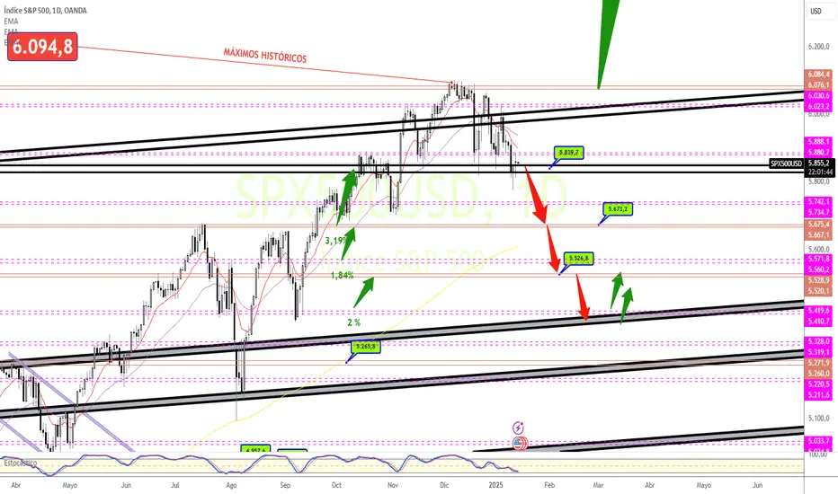 Actualmente, el S&P 500 se encuentra en una zona crítica de soporte en los 5,839 puntos. Este nivel ha actuado como un punto de contención importante durante la reciente corrección. La ruptura de este soporte podría desatar un movimiento bajista más pronunciado, llevando al índice a explorar cotas inferiores, que podrían redefinir el panorama técnico del mercado. Por ahora, los inversionistas vigilan de cerca la reacción del precio en este nivel para evaluar la continuidad del impulso alcista o el inicio de una fase correctiva más profunda.