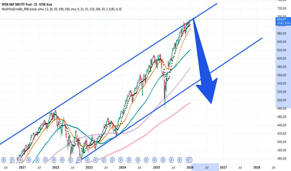 Mirando el gráfico en semanal el SPY se encuentra actualmente operando en una zona muy exigente desde el punto de vista gráfico, alrededor del área 6.850–6.980 puntos. Esta franja coincide con tres referencias simultáneas: la parte superior del canal alcista de largo plazo, una zona de expansión proyectada desde el impulso inicial post-2020 y un área donde el precio ya empezó a mostrar exceso por momentos. El primer nivel verdaderamente importante no está demasiado lejos. La zona de 6.500–6.550 puntos funciona como soporte inmediato. Es el borde superior del canal una vez reabsorbido el exceso. Mientras el mercado se mantenga por encima de esa área, el escenario sigue siendo de consolidación alta, no de corrección profunda. El rango más probable para una corrección completa, entendida como el proceso desde el máximo hasta un nuevo equilibrio, es de 24 a 42 meses.