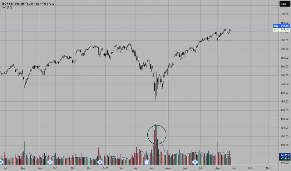 Aunque el índice S&P 500, al ser un indicador compuesto y no un activo negociable en sí mismo, no registra un volumen de transacciones, una estrategia inteligente para analizar el volumen relacionado con este índice consiste en monitorear el volumen de negociación del ETF SPY (SPDR S&P 500 ETF Trust). Este fondo cotizado replica fielmente el comportamiento del S&P 500 y atrae un alto nivel de actividad comercial, ofreciendo así una métrica valiosa para evaluar el interés del mercado, la liquidez y posibles patrones en el volumen durante tendencias alcistas o bajistas.
