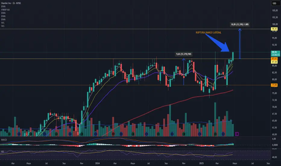 La acción de Stantec Inc., un valor sólido y de gran calidad en su sector, ha roto con fuerza el rango lateral semanal que contenía el precio desde hace meses. Esta ruptura técnica sugiere un impulso significativo en marcha.