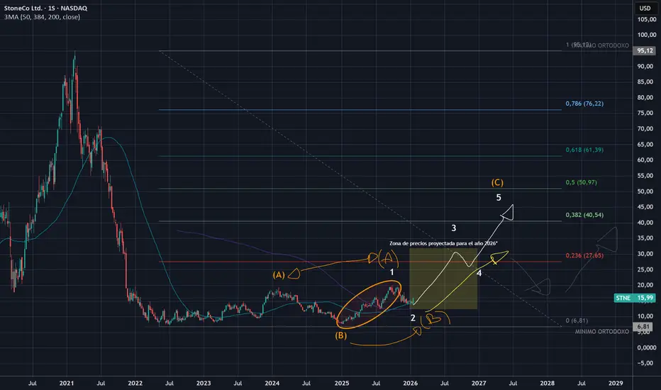 ESCENARIO 1: Mediante una estructura de CORRECCION ALCISTA en "ABC" representado en color naranja, STNE está luchando por demostrar a los inversionistas su valor en el mercado. Justo en este momento irá en "escalerita" ganando valor y la diferencia estará en la fuerza. Bajo este escenario ya estamos en la onda C, específicamente por iniciar la onda 3 representada con el "1,2,3,4,5" en color blanco. Este escenario es bello porque nos habla de un potencial importante de rendimientos y con un riesgo moderadamente alto, donde el control de los toros se aprecia menos "debilitado". Mi objetivo para el 2026 será en una zona de precios que supere los $28 - $30usd y que para el 2027 continúe siendo una acción a mantener. El trazo en color blanco representa lo que se espera suceda con la acción del precio bajo este escenario.