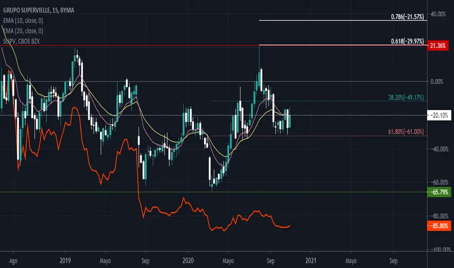 Interesante lo que se puede ver en Supervielle, velas semanales, en línea con el resto de las acciones bancarias principales. Tenemos un impulso alcista iniciado en marzo que retrocedió aproximadamente un 38% y continuó camino hacia una zona de resistencia, para luego volver a rertoceder exactamente hasta el nivel de 61%. Esta suba iniciada en marzo hasta el último retroceso nos da una extensión nada menos que a la resistencia, nivel de 61% a $86.