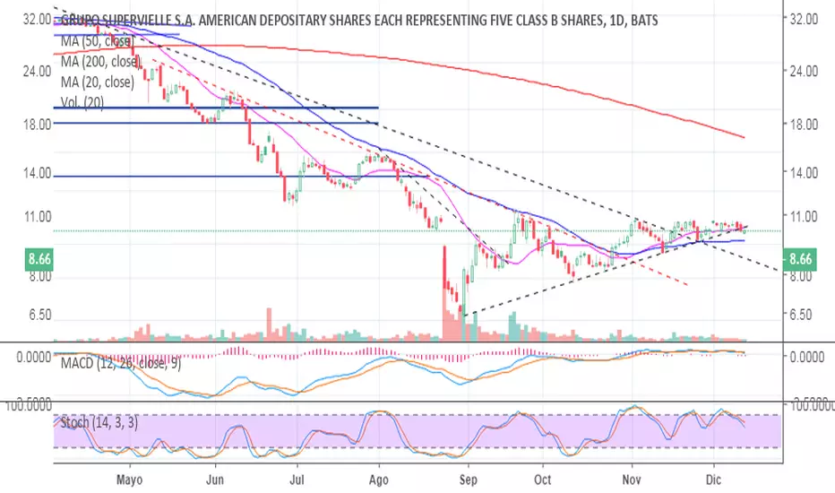 Se sigue sosteniendo sobre la tendencial bajista desde máximos pero quedó levemente por debajo de la línea alcista que viene desde mínimos y que para recuperarla debe volver rápidamente sobre 9 dólares.. de no lograrlo podría meter el pullback a la línea bajista superada en torno a los 7/7.50, con un soporte intermedio en 8