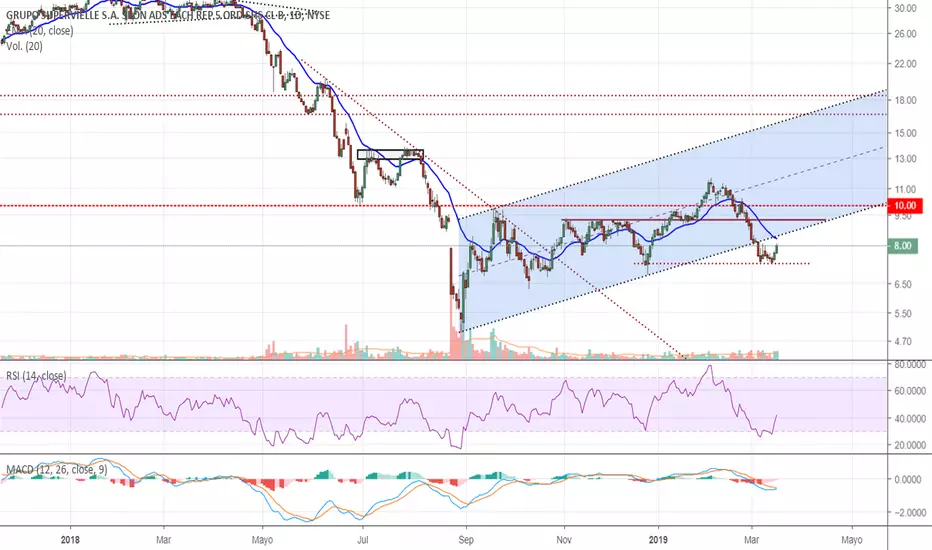 Al igual que todo el sector bancario, Supervielle viene recuperando terreno. El canal alcista que pueden observar, al haber sido quebrado a la baja, plantea ahora una resistencia dinámica a nivel de su piso, que justamente coincide con la EMA 20: doble resistencia dinámica).