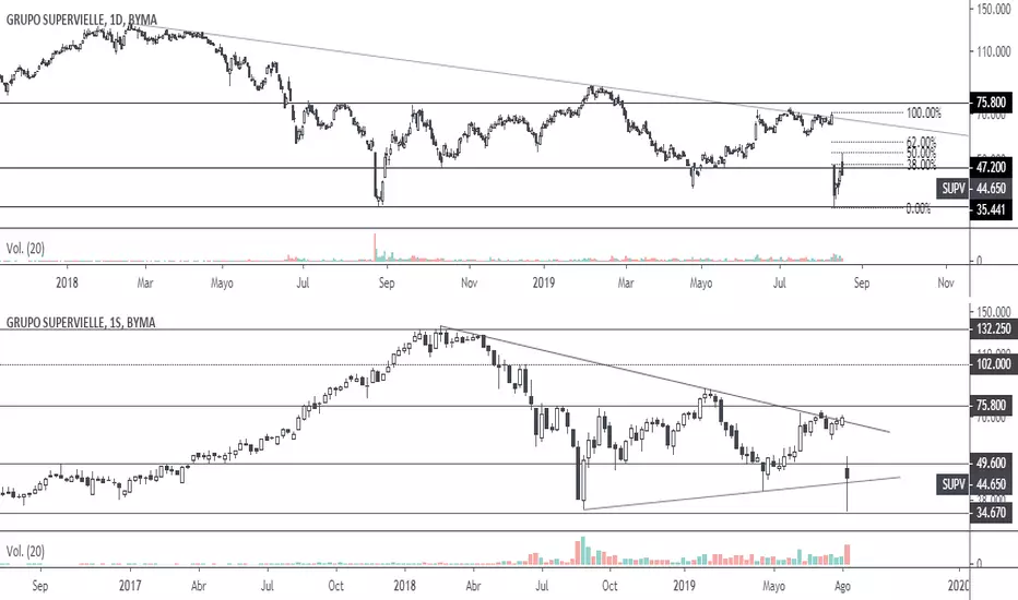 En velas semanales, el precio encontró soporte en los 35 cercano a su precio de IPO en el año 2017. Los $35 es también una zona testeada durante la crisis del año 2018. Si tomamos el mínimo de 2018 y el mínimo de 2019 durante el sell-off de abril tenemos nuestra línea de tendencia actual.