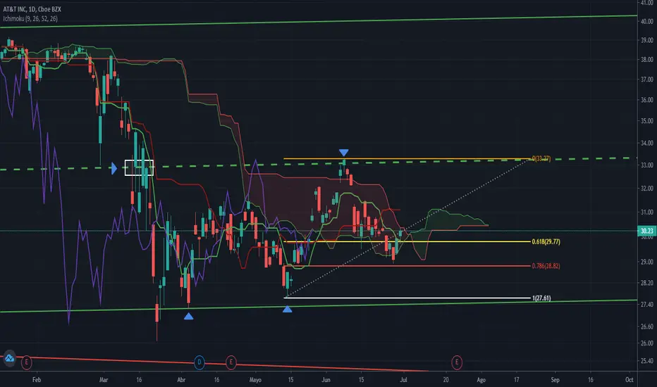 AT&T INC. (T).. No pudo pasar la mediana y retrocedió entre el 61,8 y 78,6 de fibo.. aguantando y buscando un buen lugar para salir de la nube de KUMO. Vamos a ver si logra hacerlo, el gráfico es bastante despelotado, pero sin embargo se ve viene por un buen camino.