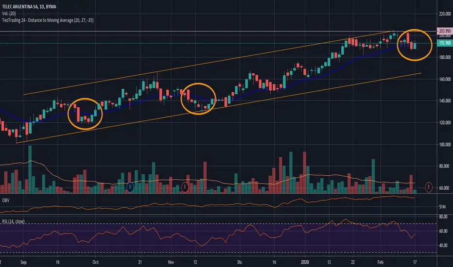 Al estar en tendencia alcista, cuando se acerca a la EMA 20 suele continuar la suba. En varias oportunidades llega a estar debajo de la misma por algunas velas para despues seguir el camino alcista.