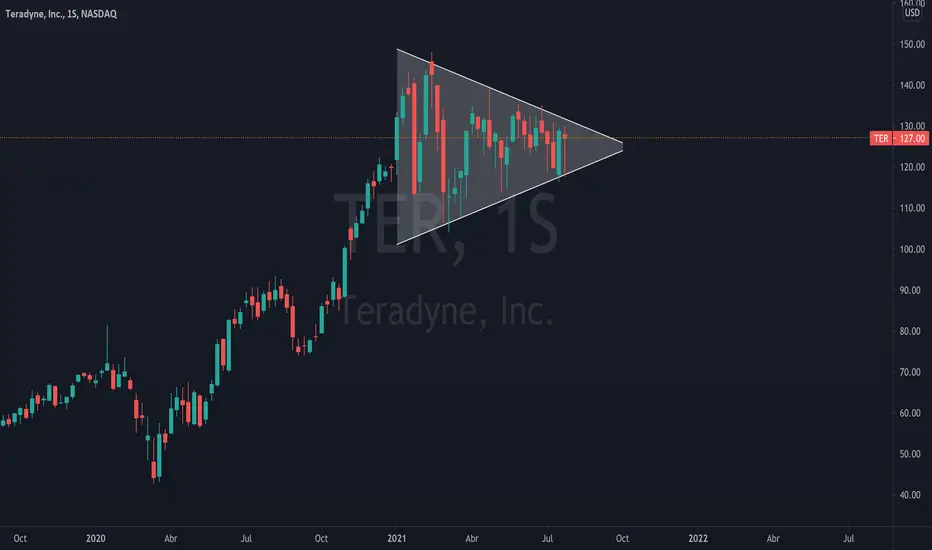 Teradyne. En este caso, el movimiento debería ser más lento ya que la gráfica que estamos analizando es más amplia de lo normal. Una rotura alcista de este patrón debería dejarnos un movimiento que podría operarse en largo buscando nuevos máximos históricos.