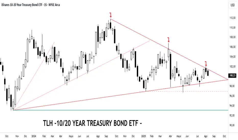 La lucha en el mundo de las tasas continua sin tregua entre bulls y bears y obviamente en los productos relacionados como los etfs. Mas aun a medida que se achican los tiempos de cara al próximo FOMC, el cual tiene fecha para el 20 del próximo mes de Septiembre. Este etf, el mas importante que nuclea bonos del tesoro entre 10 y 20 años, cerro por 2da semana consecutiva en baja tras lo que fuera su impacto en la linea tendencial declinante originada en su ultimo máximo, o sea en la resistencia que los bulls deben superar en terminos base cierre semanal si pretenden ir por mas ( no antes ).