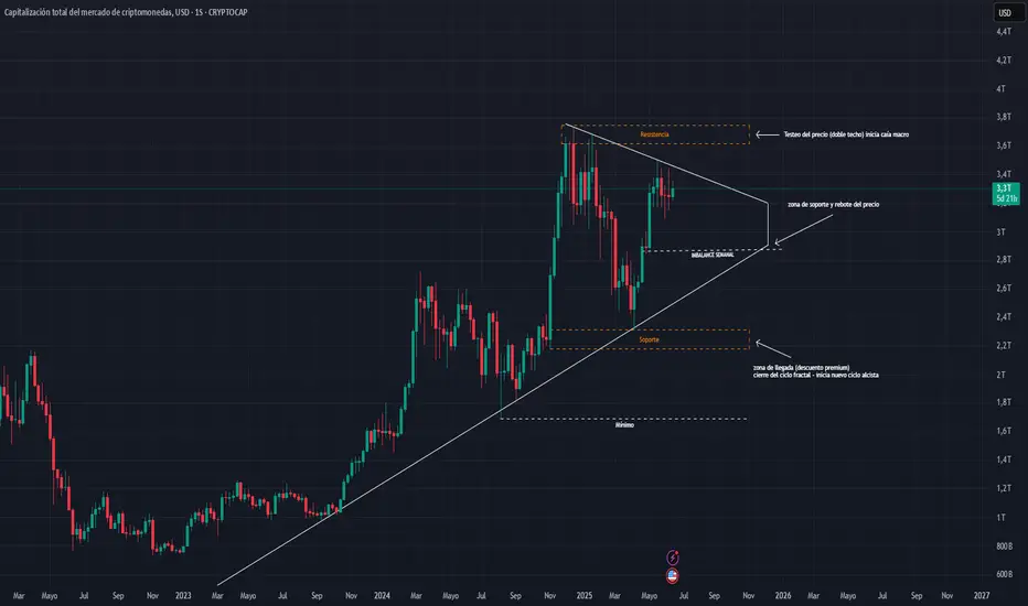 Posibles movimiento del total market crypto iniciando un período fuerte de corrección bajista, zonas claves de su inicio, retroceso y finalización, ante de revertir una nueva tendencia en dirección alcista y máximos de capitalización.
