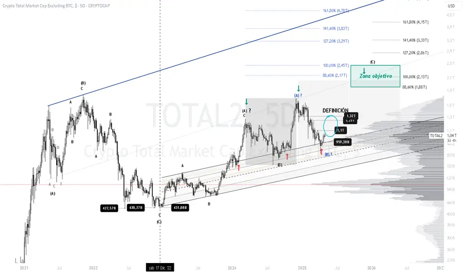Podemos estar transitando un nuevo ciclo en las Altcoins basandonos en el análisis de la capitalización de mercado #TOTAL2 en visperas de una onda (C) o 3 ya que aún no podemos confirmar movimintos impulsivos claros, a priori podemos contar estructuras que van de 3 en 3.