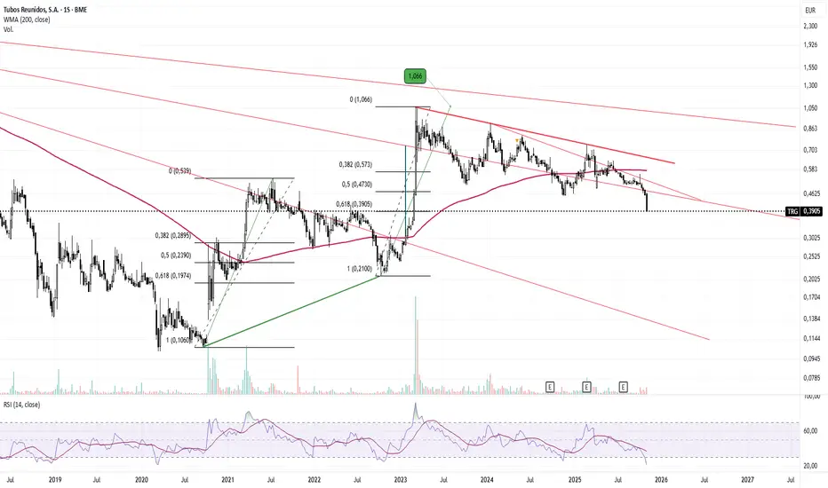 Otro chicharro que si elucubramos mucho... en semanal ha parado justo en el 0,618 del 2º fibo alcista. La semana próxima puede puede que pierda este 0,618 pero cierre la semana por encima, es decir por encima de 0,3905€ que es donde ha parado hoy. Si esto sucediera en gráfico diario bajaría claro está y probablemente bajaría al menos hasta los 0,3755€ para cerrar un gap alcista del 28 de febrero de 2023 y a partir de ahí volver a escalar despacio.