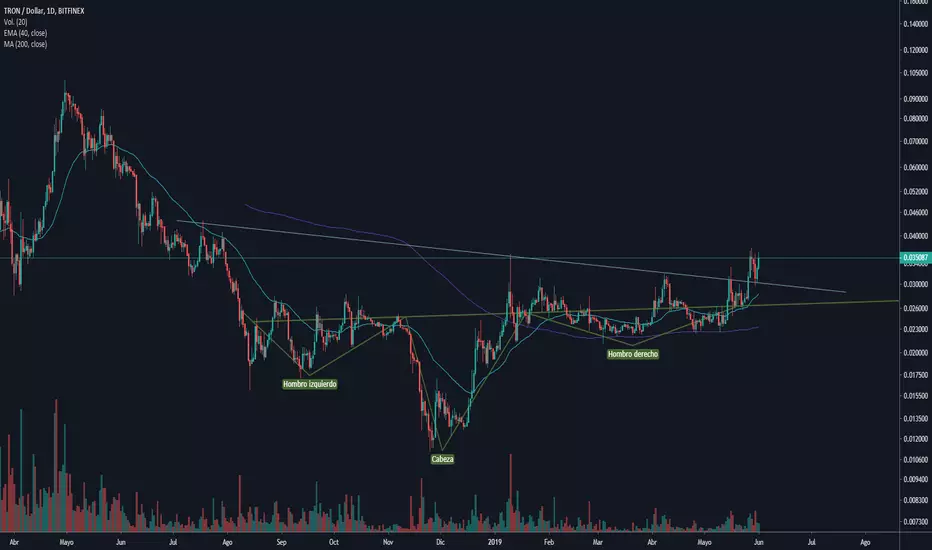 Podemos ver la formacion de un HCH en par TRX de varios meses, tambien ya hay una ruptura y posible pull back en la linea de resistencia que esta actuando como soporte ya en este punto. tambien reboto en las medias de 40 y 200 dias previamente.
