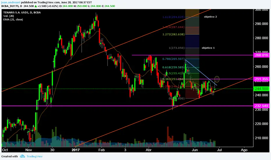 Respetó nuevamente la LTB con buen volumen. Necesita mantenerlo para superar los 0.5 de fibonacci (251). Objetivos marcados por extenciones.