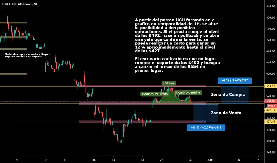 A partir del patron HCH formado en el grafico en temporalidad de 1H, se abre la posibilidad a dos posibles operaciones. Si el precio rompe el nivel de los $492, hace un pullback y se abre una vela que confirma la venta, se puede realizar un corto para ganar un 12% aproximadamente hasta el nivel de los $427.