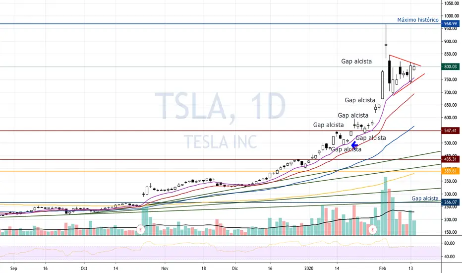 El precio por acción de Tesla cerró con un +6% la semana, pero se ha dejado un Doji en el gráfico semanal. Esto refleja la indecisión vista esta semana en el mercado, en cuanto a la futura dirección a seguir. Cuando vemos el gráfico diario, esta vela doji se traduce en un triángulo simétrico, en la que hemos tenido altos más bajos y bajos más altos, acotando al precio entre los $700 y los $800.