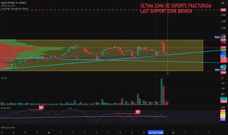 Como comentamos, la firma no ha perdido la tendencia bajista de los últimos 12 meses, realizando un pérdida del 33%, reduciendo su capitalización bursátil a los 1.700 millones de euros. Actualmente, la acción cotiza en un rango entre los 10,480 y 10,610 euros por título, mostrando una clara tendencia bajista, que por el momento ni Tencent ha logrado deshacer. El viernes, Ubisoft experimentó un repunte en el precio, cerrando la jornada con una vela roja con mecha muy larga, lo que indica una toma de beneficios tras la subida. Destaca el volumen de 3,93 millones de dicha sesión, una cifra excepcional considerando que durante el trimestre apenas se ha superado el millón de volumen de negociación en la mayoría de las sesiones.