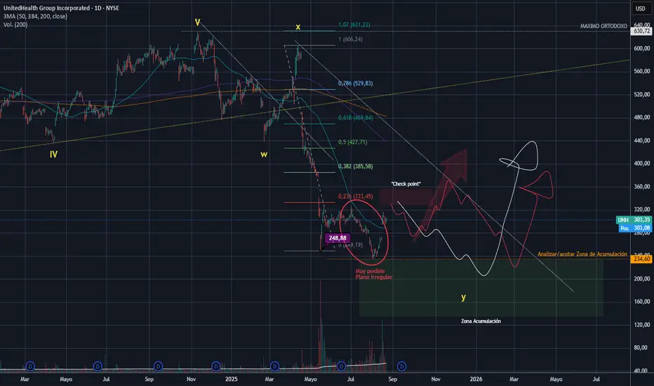 ¿Qué les podría aportar de UNH basado en Teoría de ondas de Elliott y lo que veo en la gráfica?