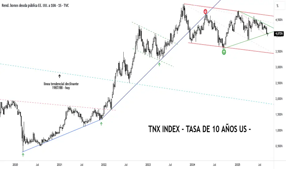La tasa que devenga el bono a 10 años de EEUU, el benchmark natural del mercado de renta fija, cerro finalmente la semana en la linea que representa en el hoy su soporte extremo y que ya te apuntara hace unos 10 días atrás ( adjunto informe) o sea la linea inferior de triangulo en el cual esta inmerso hace aproximadamente un año y por lo tanto si o si el foco debe estar allí dada su relevancia en terminos base cierre semanal. Nota : en el intra semanal y en lo que fue su mínimo durante los últimos meses, la misma penetro por 1era vez la cota de 4, mas como apuntara en el inicio, concluyo la semana un tanto alejado de la misma, que es donde también arranca esta semana en la cual finalmente la Fed reducirá "su tasa", mas lo que espera el mundo financiero es lo que pueda decir su presidente, el Sr Powell.