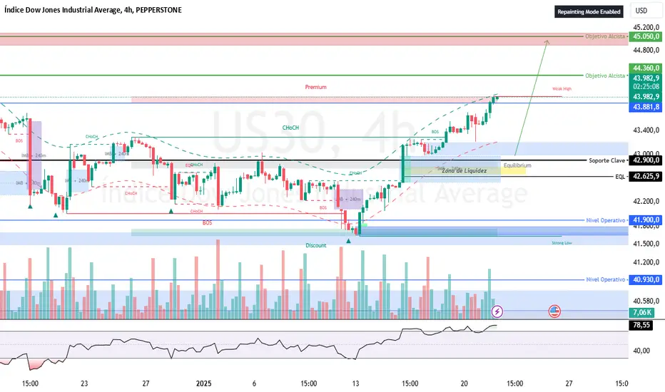 📊 El Dow Jones podría avanzar hacia 44360 y 45050, siempre que el nivel clave de soporte en 42900 se mantenga firme. Si el precio permanece por encima de este nivel, se favorecen posiciones largas. Sin embargo, si el precio cae por debajo de 42900, podríamos observar un movimiento bajista hacia 41900 y 40930.