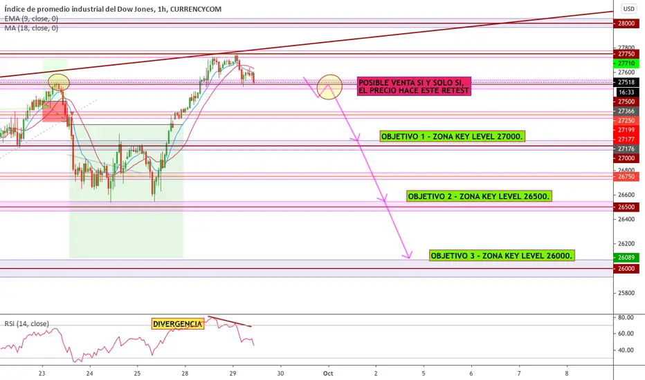 Observo una posible venta si y solo si el precio realiza el retest como se muestra en la imagen, debido a que es posible que se este formando un retest a la linea de tendencia (burdeo), tal como se analizó a principio de la semana pasada en gráfico diario, también observo una divergencia marcada en el indicador RSI.