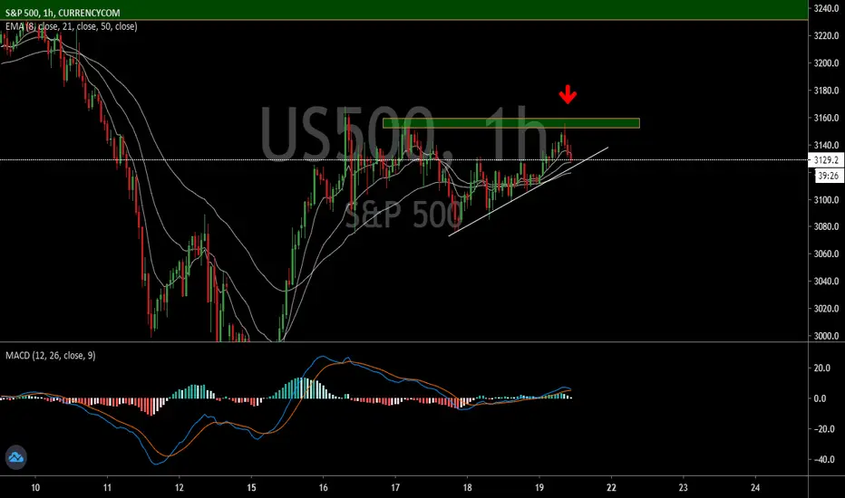 Me baso en 3 EMA´S (8,21,50) y el MACD en donde el precio llega a una zona de resistencia acompañado de la pérdida de momentum alcista, como se trata del US500 depende al 100% de la FED por lo que estaría al tanto de las noticias, pero en cuestión de análisis técnico, esta es la visión que tengo.