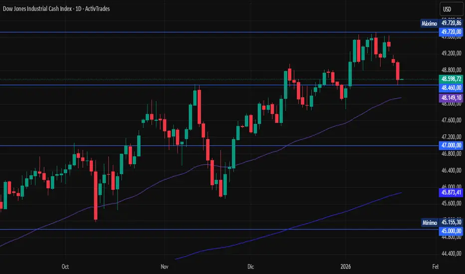 El índice del Dow Jones viene retrocediendo a la baja desde la zona de máximos históricos en los 49.720 puntos y cae hasta los 48.460 puntos, nivel que fue resistencia en el pasado y que ahora podría cambiar de función a soporte.