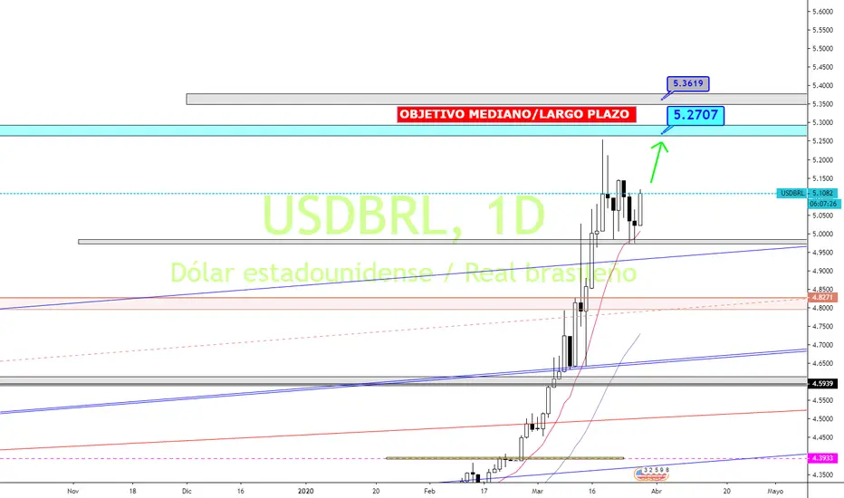 El real brasileño después de rebotar en su soporte ,esta devaluando 1.85%, objetivos de mediano y largo plazo entre 5.27 y 5.36 aprox.